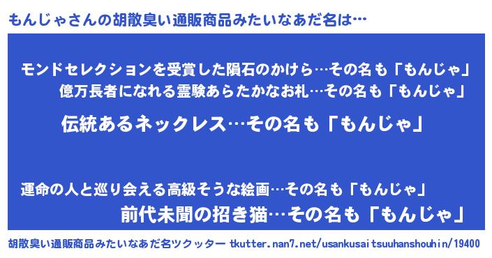 | 男性向けラノベタイトル風あだ名 | 『もんじゃの嫁は女の子じゃないと思った?』 |
