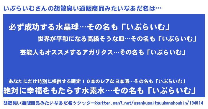 | 男性向けラノベタイトル風あだ名 | 『Re:いぶらいむから始める異世界生活』 |