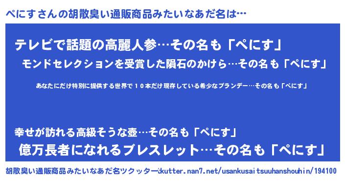 | ヘコむあだ名 | 『ぺにっふぃ~』『なまこ酢』 |