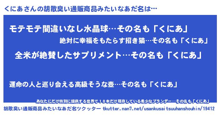 | 男性向けラノベタイトル風あだ名 | 『くにあ~年齢イコール彼女いない歴の魔法使い~』 |