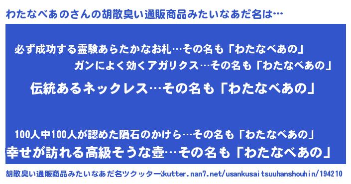 | 欧米人風あだ名 | 『アンジェラ・わたなべあの』 |