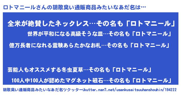 | 男性向けラノベタイトル風あだ名 | 『ロトマニールアートオンライン』 |