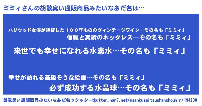 | ヘコむあだ名 | 『ミミィ(苦笑)』『ミミにー』『豆乳』 |