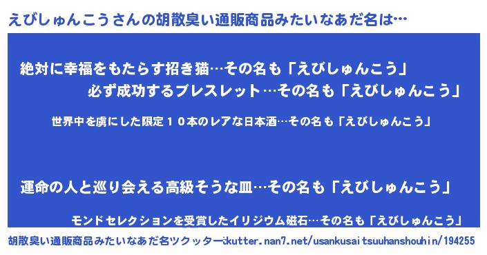 | 意味不明あだ名 | 『住所不定無職えびしゅんこう(50歳)』 |