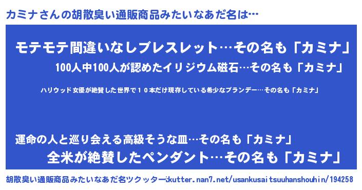 | 意味不明あだ名 | 『住所不定無職カミナ(77歳)』 |