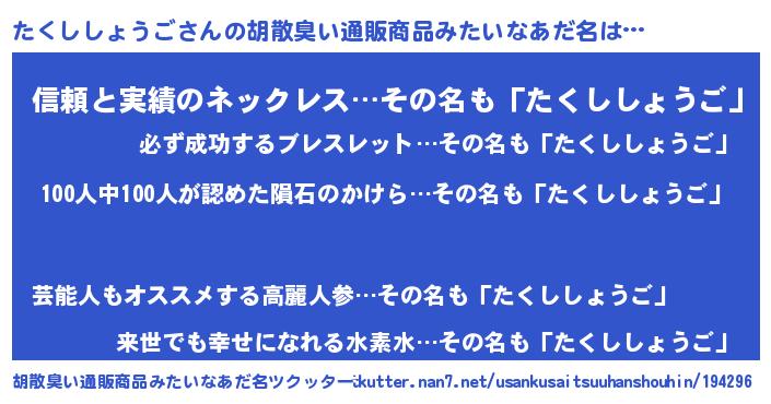 | ヘコむあだ名 | 『たくぷりん』『たくししょうご(笑)』 |