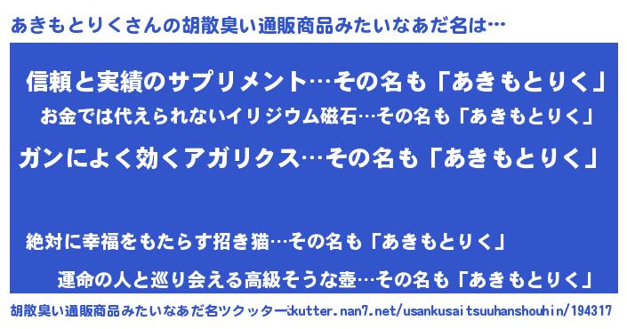 | 肩書あだ名 | 『あきもとりく総統』『あきもとりく塾長』 |