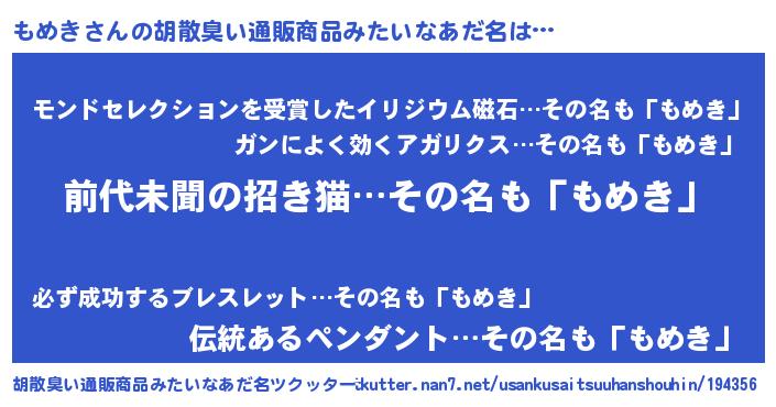| 男性向けラノベタイトル風あだ名 | 『もめき~年齢イコール彼女いない歴の魔法使い~』 |