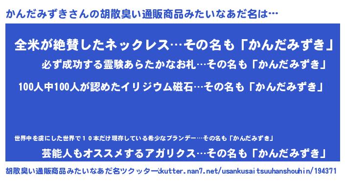 | 男性向けラノベタイトル風あだ名 | 『おまえをオタクにしてやるから、俺をかんだみずきにしてくれ! 』 |