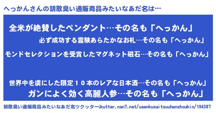 | 欧米人風あだ名 | 『ダニエルへっかん』『ウサインへっかん』 |