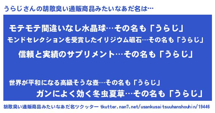 | 意味不明あだ名 | 『とにかく怪しいうらじ』『自称うらじ』 |