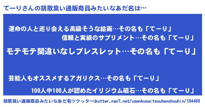 | 男性向けラノベタイトル風あだ名 | 『てーりの憂鬱』『緋弾のテーリ』 |
