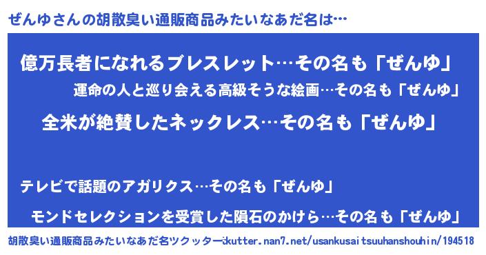 | 女子向けラノベタイトル風あだ名 | 『ぜんゆ様がみてる』『死神ぜんゆの再婚』 |
