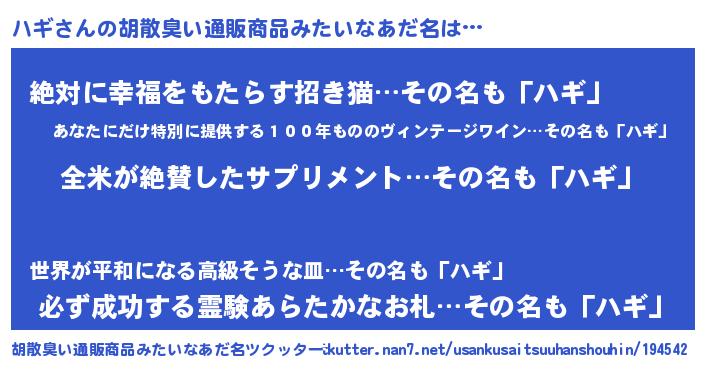 | ポケモン風あだ名 | 『ハギゴンZ』『ヒハギ』『ゼニハギ』 |