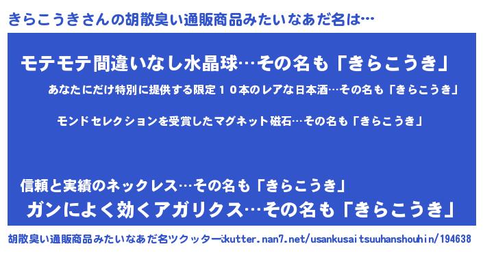 | 男性向けラノベタイトル風あだ名 | 『きらこうき~年齢イコール彼女いない歴の魔法使い~』 |