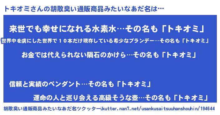 | 女子向けラノベタイトル風あだ名 | 『トキオミ恋絵巻』『トキオミの契約王妃』 |