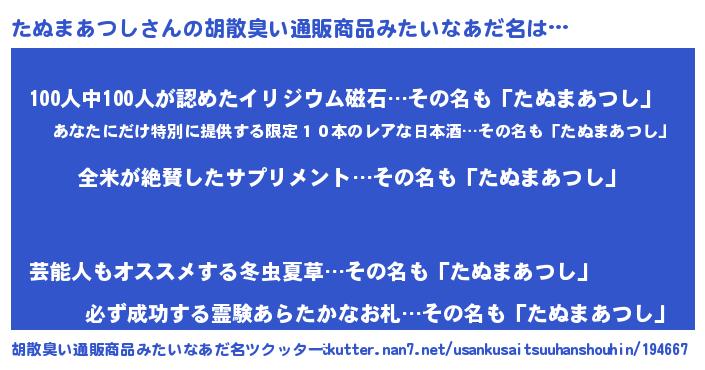| 意味不明あだ名 | 『とにかく怪しいたぬまあつし』 |
