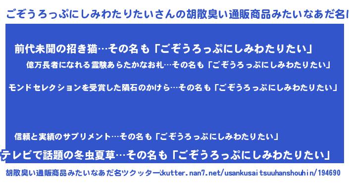 | ヒーロー風カッコイイあだ名 | 『天空の使者ごぞうろっぷにしみわたりたい』 |