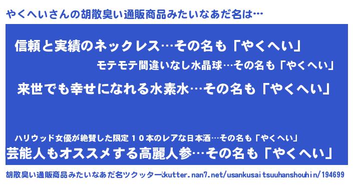 | 女子向けラノベタイトル風あだ名 | 『やくへいの契約王妃』『闇のやくへい』 |