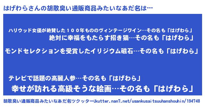 | 男性向けラノベタイトル風あだ名 | 『ノーゲーム・ノーハゲワラ』 |