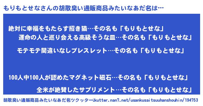 | ヘコむあだ名 | 『もりふぇ~』『もりもとせな(笑)』 |