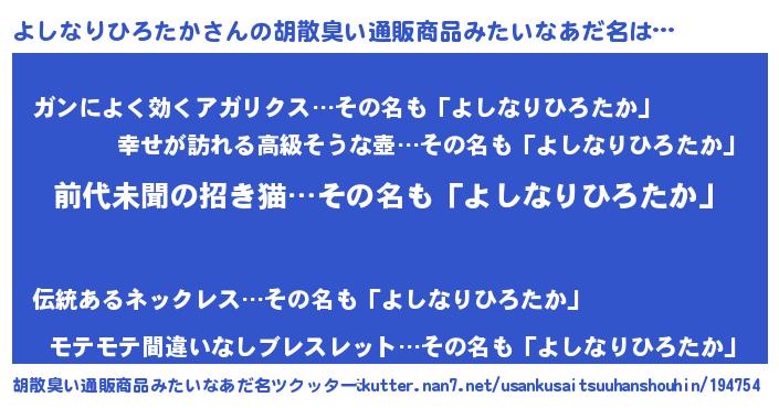 | 男性向けラノベタイトル風あだ名 | 『うちのよしなりひろたかが世界を掌握している!』 |