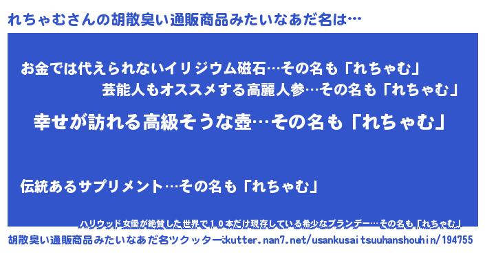 | 女子向けラノベタイトル風あだ名 | 『れちゃむの雑貨屋さん』 |