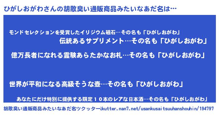 | 男性向けラノベタイトル風あだ名 | 『ひがしおがわ~年齢イコール彼女いない歴の魔法使い~』 |