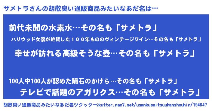| ヒーロー風カッコイイあだ名 | 『ウルトラサメトラマン』『ネオサメトラ』 |