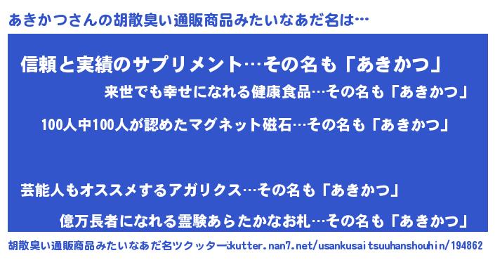 | 男性向けラノベタイトル風あだ名 | 『アキカツスレイヤー』 |