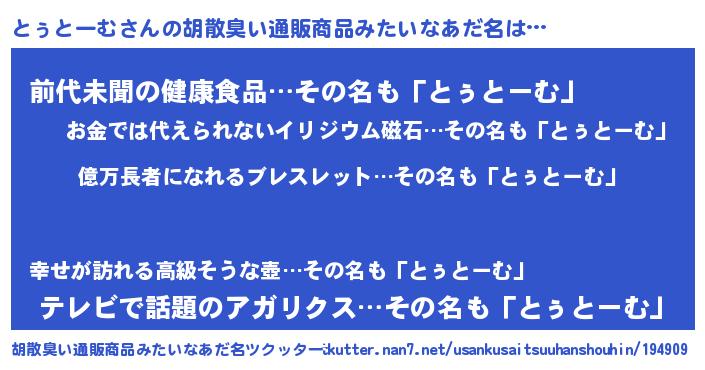 | 男性向けラノベタイトル風あだ名 | 『とぅとーむ~年齢イコール彼女いない歴の魔法使い~』 |