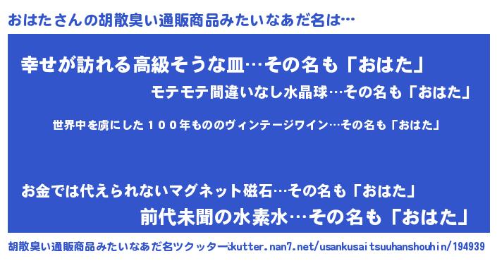 | 男性向けラノベタイトル風あだ名 | 『この素晴らしい世界におはたを!』 |