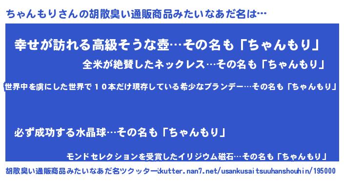 | 男性向けラノベタイトル風あだ名 | 『この素晴らしい世界にちゃんもりを!』 |