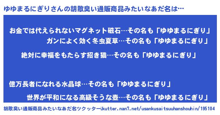 | 男性向けラノベタイトル風あだ名 | 『ゆゆまるにぎりという概念が存在しない退屈な世界 』 |