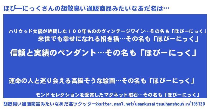 | 男性向けラノベタイトル風あだ名 | 『ダンジョンにほびーにっくを求めるのは間違っているだろうか』 |