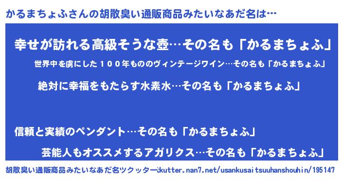 | 男性向けラノベタイトル風あだ名 | 『かるまちょふという概念が存在しない退屈な世界 』 |