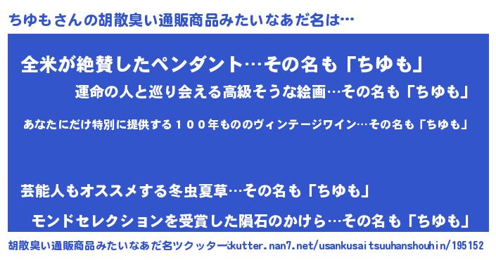 | 意味不明あだ名 | 『住所不定無職ちゆも(2歳)』『自称ちゆも』 |