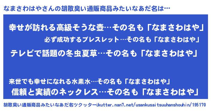 | 意味不明あだ名 | 『自称なまさわはや』 |