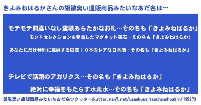 | 男性向けラノベタイトル風あだ名 | 『きよみねはるか~年齢イコール彼女いない歴の魔法使い~』 |
