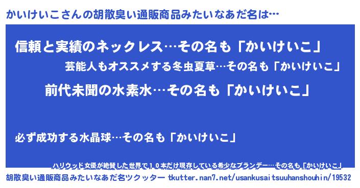| ヘコむあだ名 | 『かいけいこ(苦笑)』『かい太郎』 |