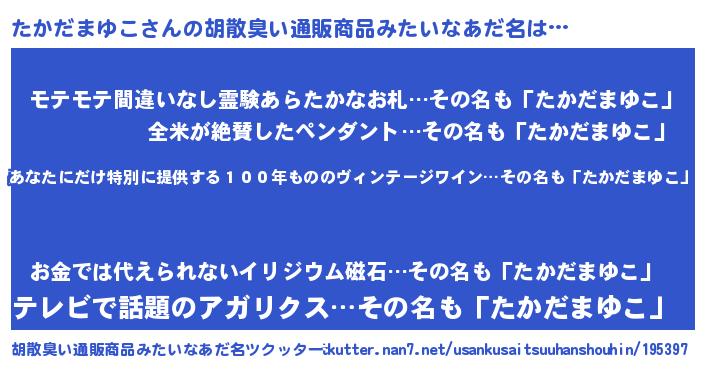| 男性向けラノベタイトル風あだ名 | 『たかだまゆこ~年齢イコール彼女いない歴の魔法使い~』 |