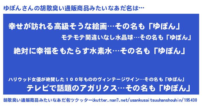 | 男性向けラノベタイトル風あだ名 | 『ゆぽんという概念が存在しない退屈な世界 』 |