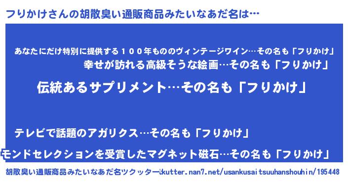 | 女子向けラノベタイトル風あだ名 | 『フりかけの卵を拾いまして』 |