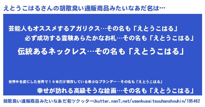 | 意味不明あだ名 | 『とにかく怪しいえとうこはる』 |
