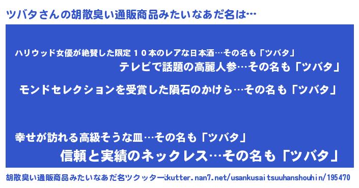 | ヒーロー風カッコイイあだ名 | 『天空の使者ツバタ』『仮面ツバダー』 |