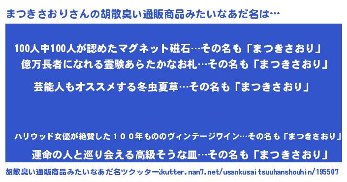 | 男性向けラノベタイトル風あだ名 | 『まつきさおり~年齢イコール彼女いない歴の魔法使い~』 |