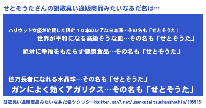 | 意味不明あだ名 | 『永久保存せとそうた』『自称せとそうた』 |