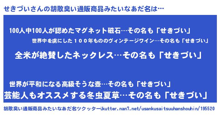 | 男性向けラノベタイトル風あだ名 | 『せきづい~年齢イコール彼女いない歴の魔法使い~』 |