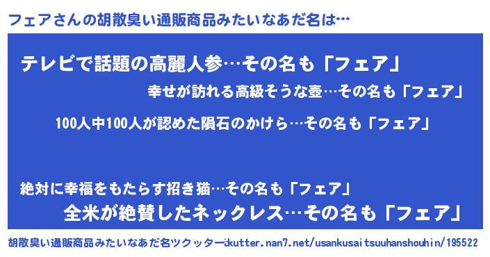 | ヘコむあだ名 | 『フェぷりん』『なまこ酢』 |