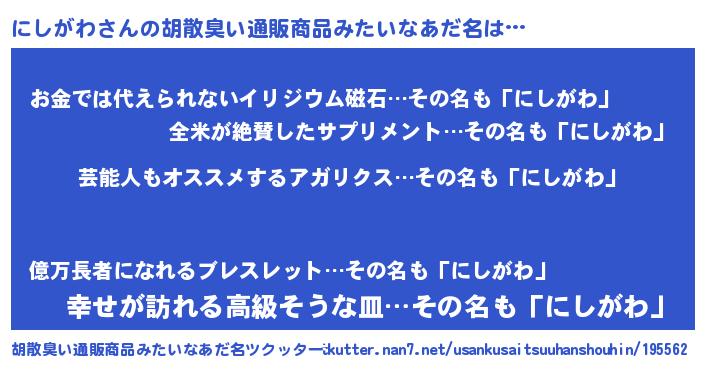 | 意味不明あだ名 | 『自称にしがわ』『にしがわフォーエバー』 |